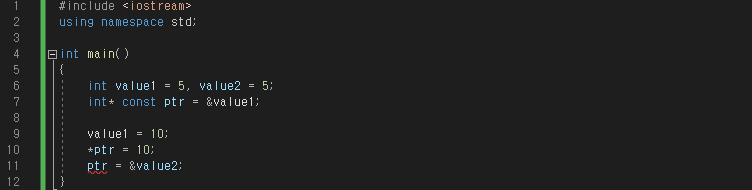 상수 포인터를 사용하면 const가 값을 변경 못하게 하지 않고 주소를 변경하지 못하게 한다. 위의 결과 처럼 ptr의 주소를 변경하려고 하면 오류를 발생시킨다. 포인터가 상수이기 때문에 포인터 값을 변경할 수가 없다. 하지만 포인터가 상수이지 포인터가 가리키는 값은 상수가 아니기 때문에 *ptr = 10과 같이 포인터가 가리키는 값을 변경하는 것은 가능하다.