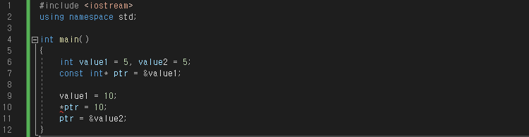 - 상수를 가리키는 비 상수 포인터는 가리키는 값을 수정 불가능하지만 다른 변수를 가리키도록 자신의 주소를 바꿀 수 있다.
