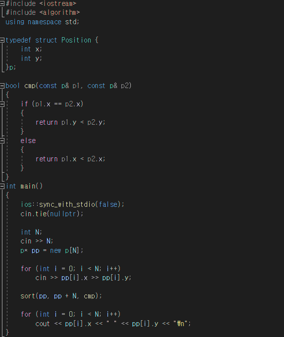 구조체를 이용해서 x, y를 묶으게 되면 좌표도 sort 함수를 사용하여 간편하게 정렬할 수 있다.